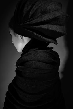 The pleated shapes are an allusion to the bird outlines. Pointed ice crystals are dotted with red to remind of reticular veins: fluent, feminine, organic. The red glass beads simply break the cold effect of the black fabrics.